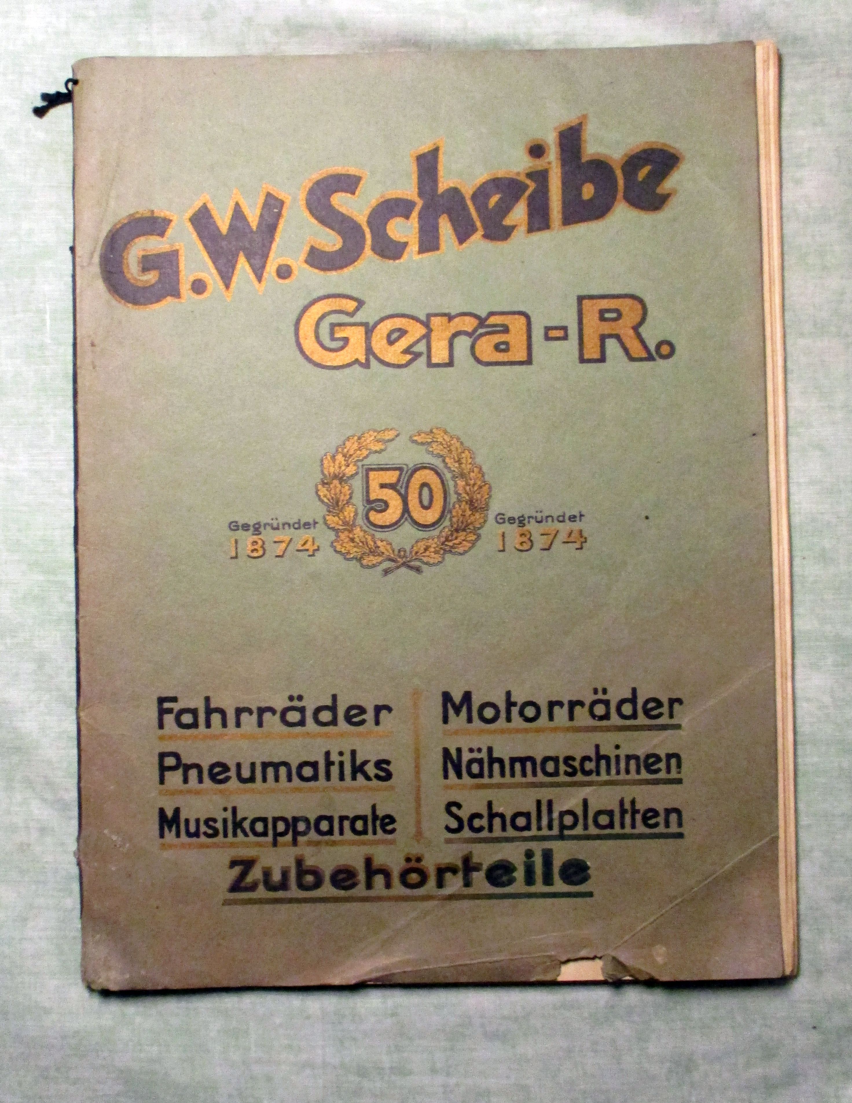 Firmengeschichte + Firmenkataloge G.W. Scheibe – Gera-R. Fahrräder – Motorräder – Pneumatiks – Nähmaschinen – Musikapparate – Schallplatten. Hauptpreisliste + Nachtrags-Preisliste 1926. 1925/26 Hauptpreisliste: 56 Seiten, Nachtragsliste 20 Seiten. 31 Abb. der Geschäftsräumlichkeiten (Büro, Lager, Werkstätten) Das Preisverzeichnis ohne Abbildungen. Einband mit Knickspuren und Randläsur. Innen einwandfrei.