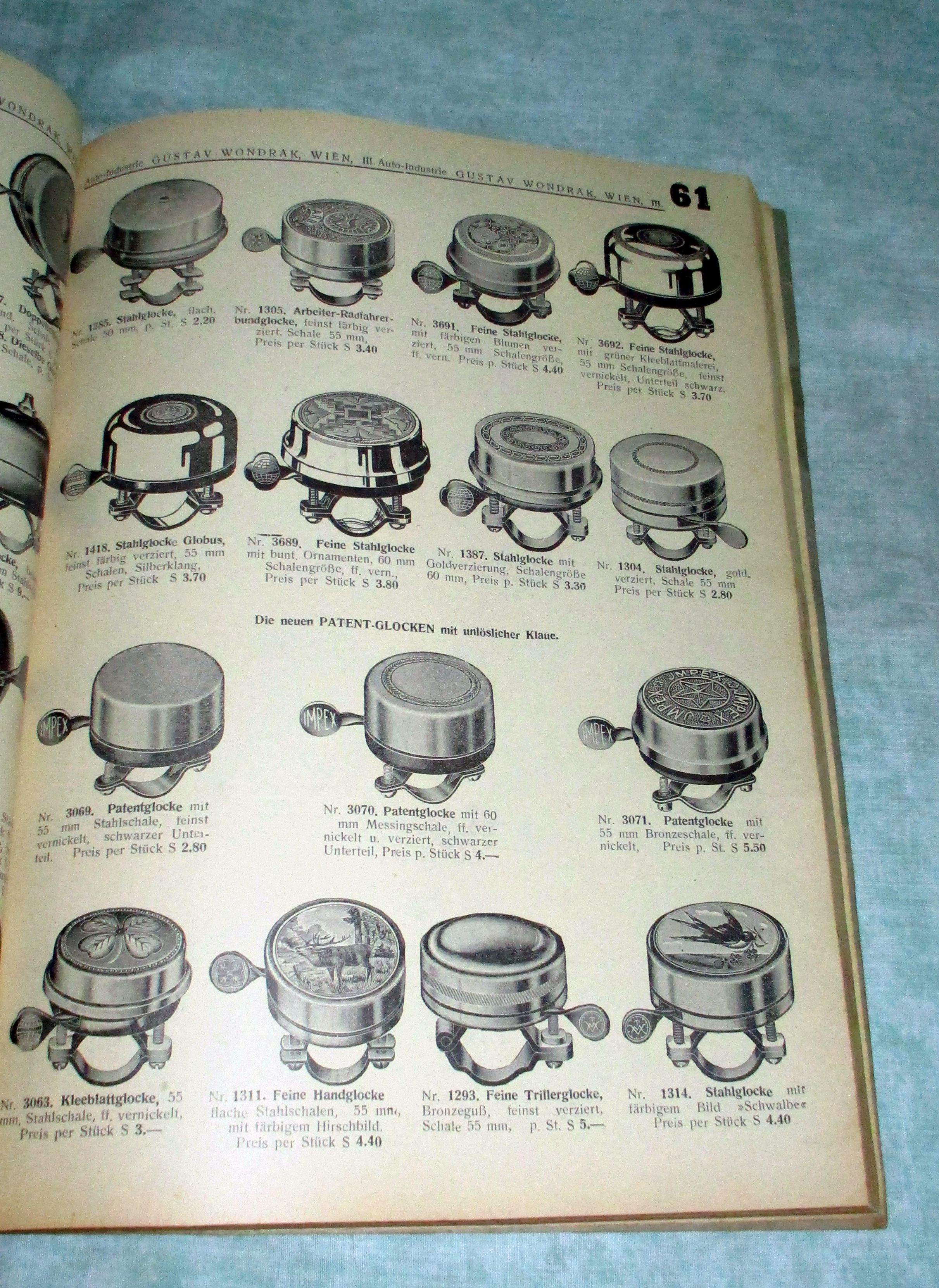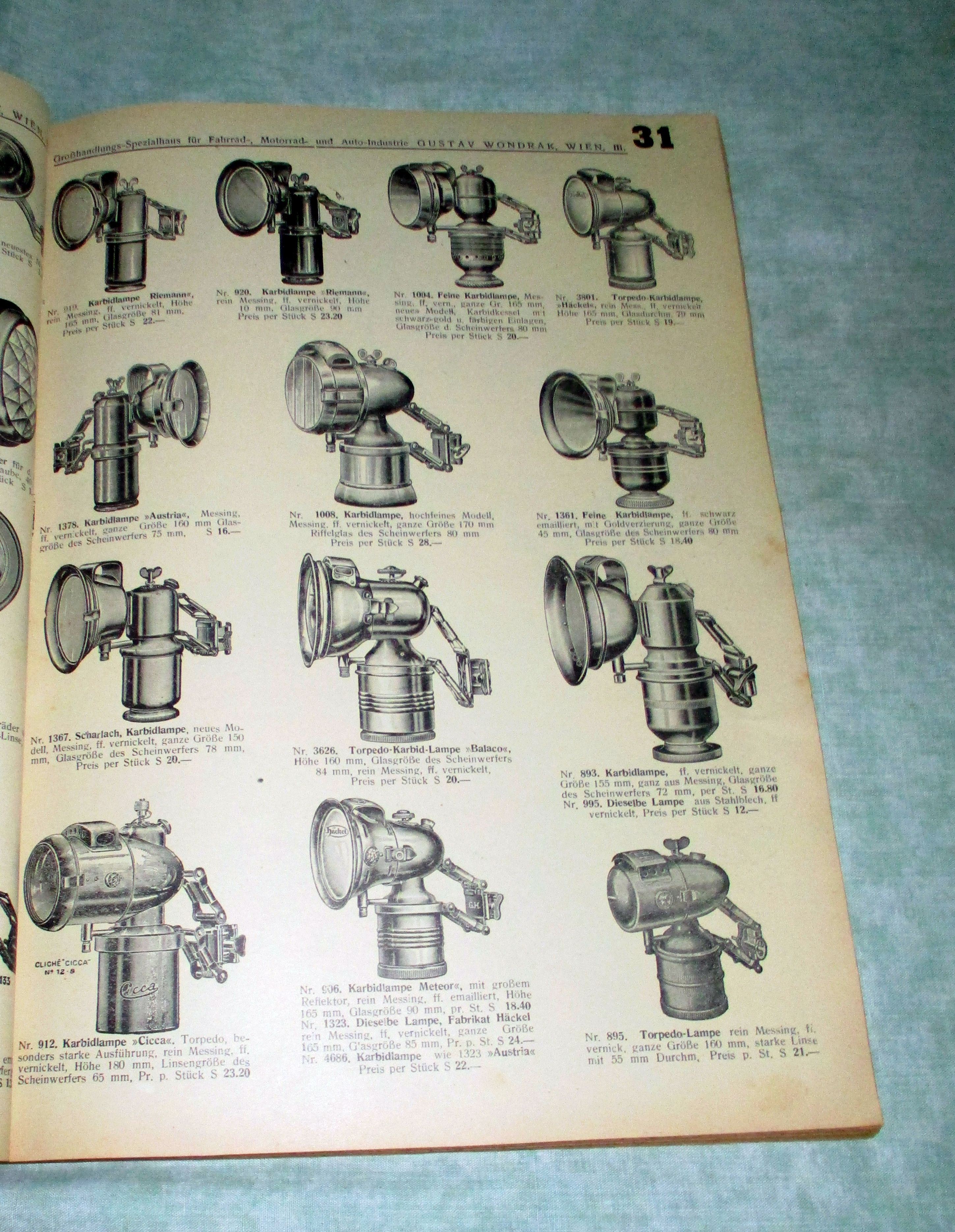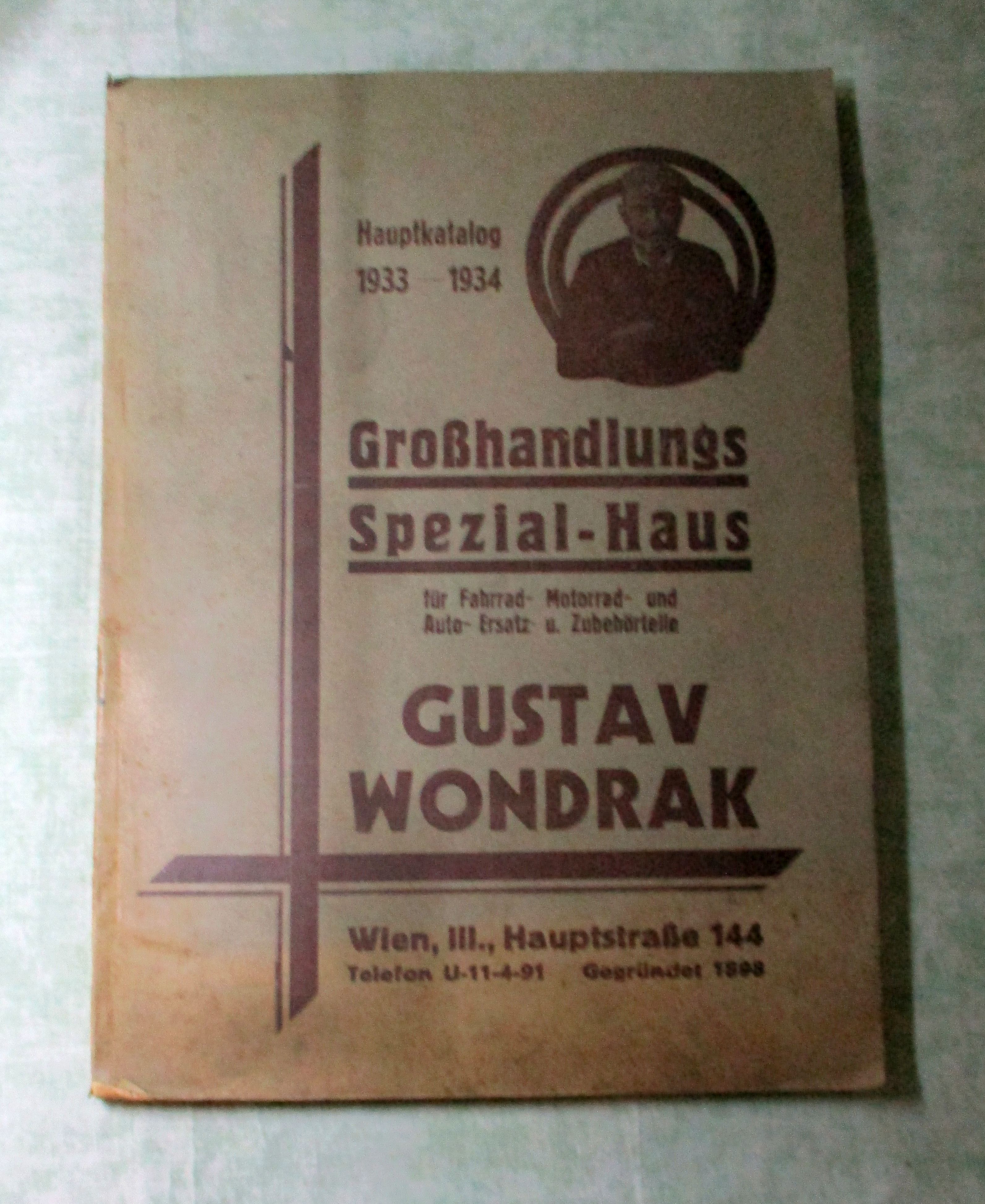 Firmengeschichte + Firmenkataloge Gustav Wondrak – Großhandlungs Spezial-Haus für Fahrrad- Motorrad- und Auto- Ersatz- und Zubehörteile. Wien III., Hauptstrasse 144. Hauptkatalog. Preisliste Nr. 380, 1933/34. 25 x 34 cm ! 188 Seiten, durchgehend illustriert. kart. Einband leicht fleckig, Bindung fest, innen sauber. Originalkatalog!