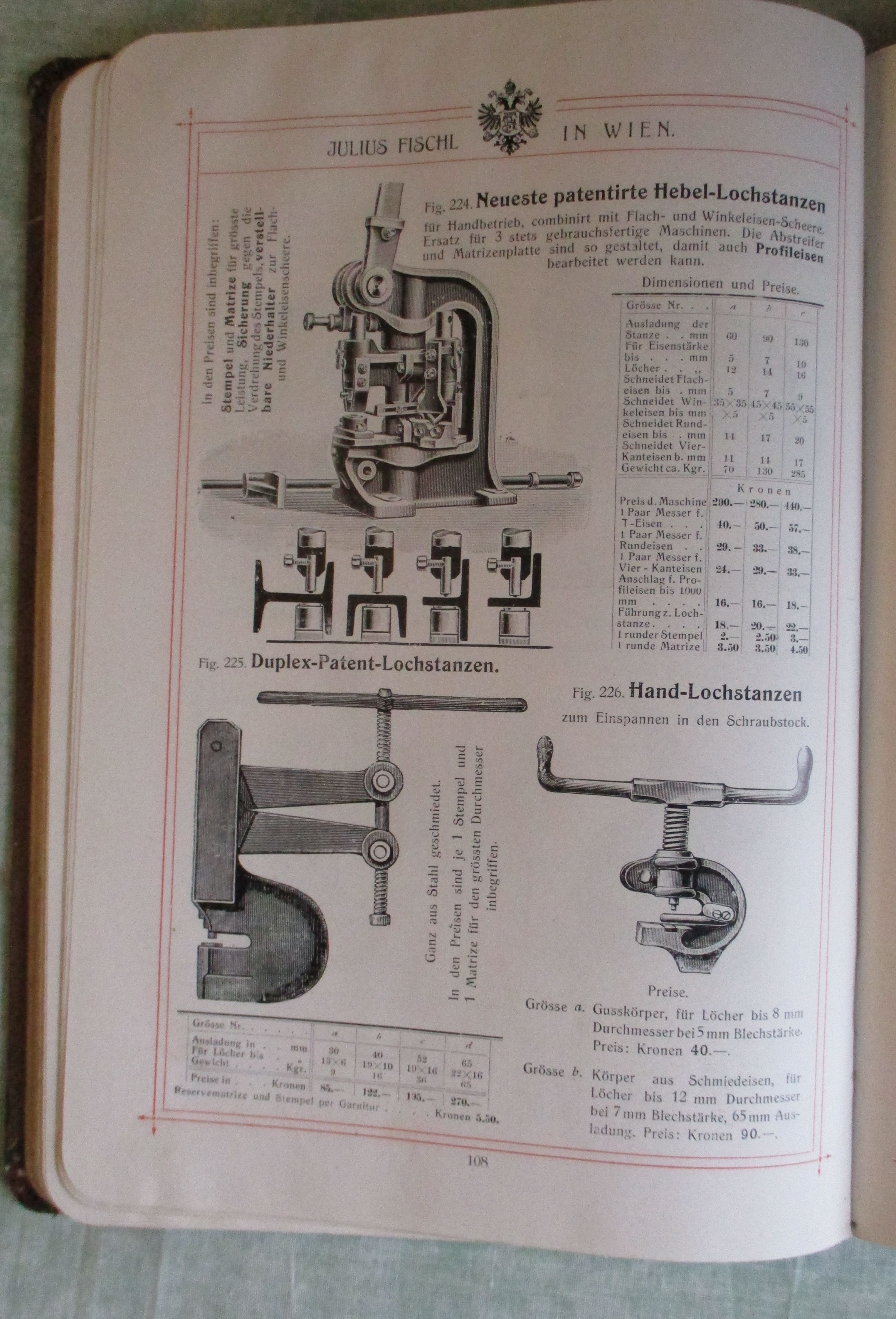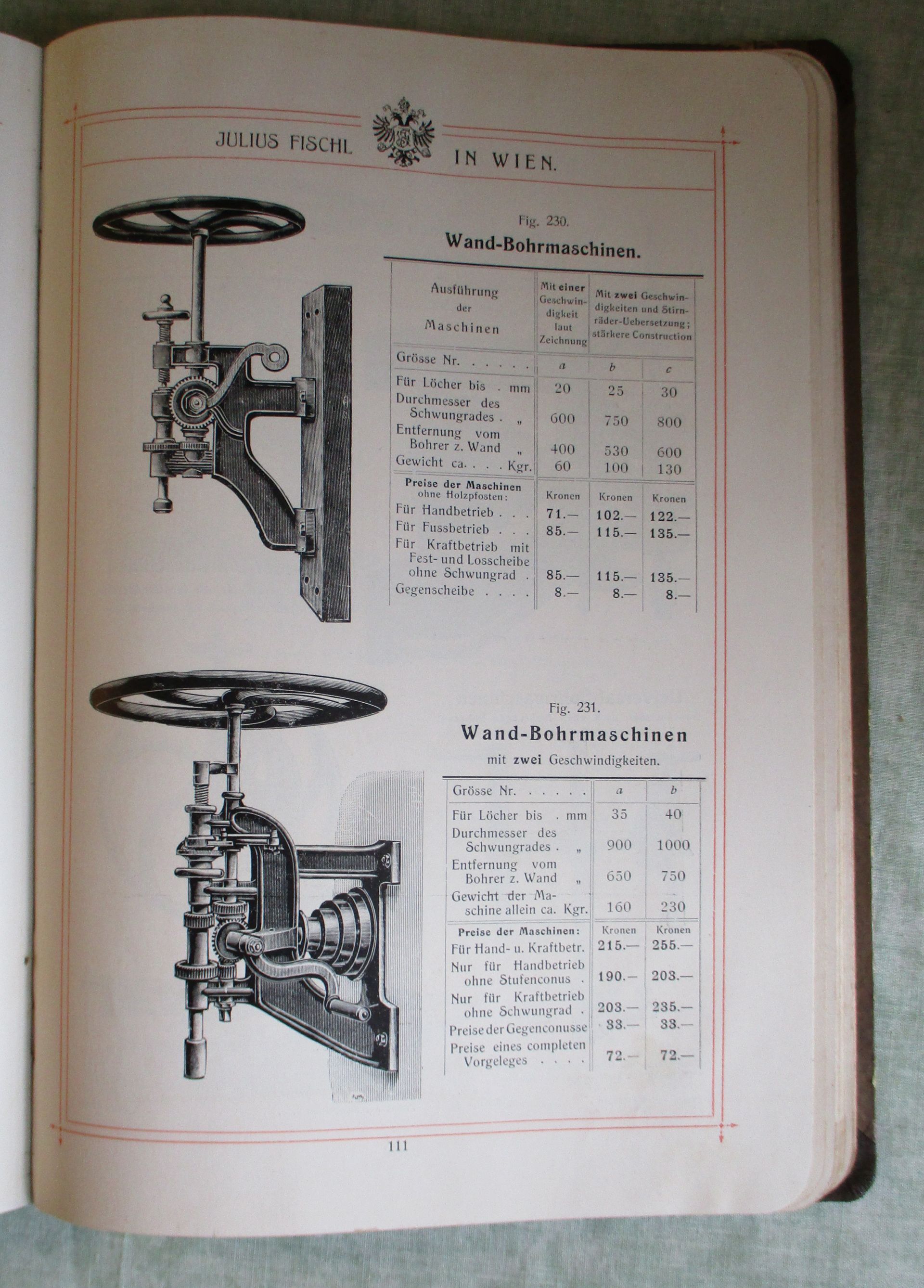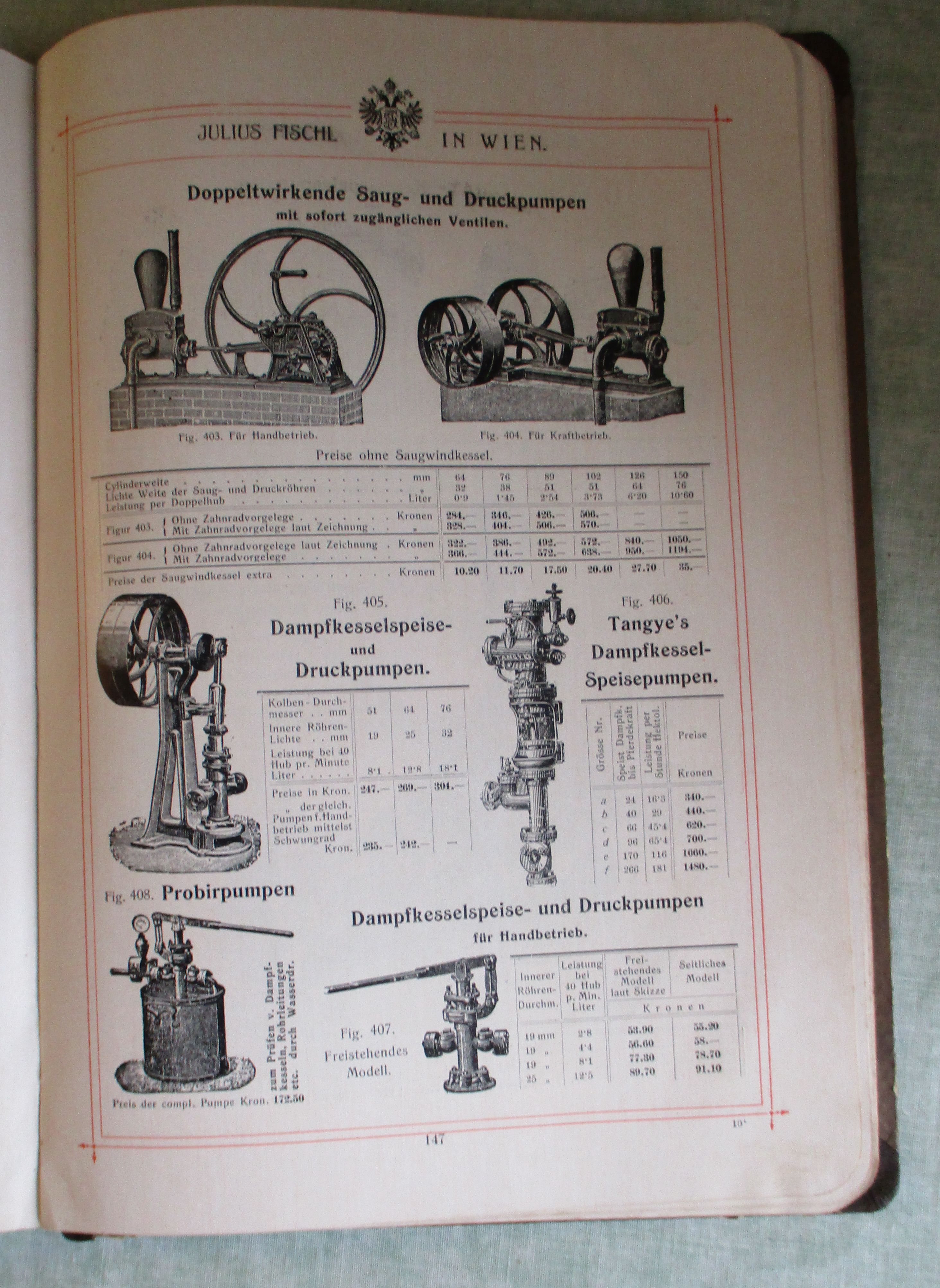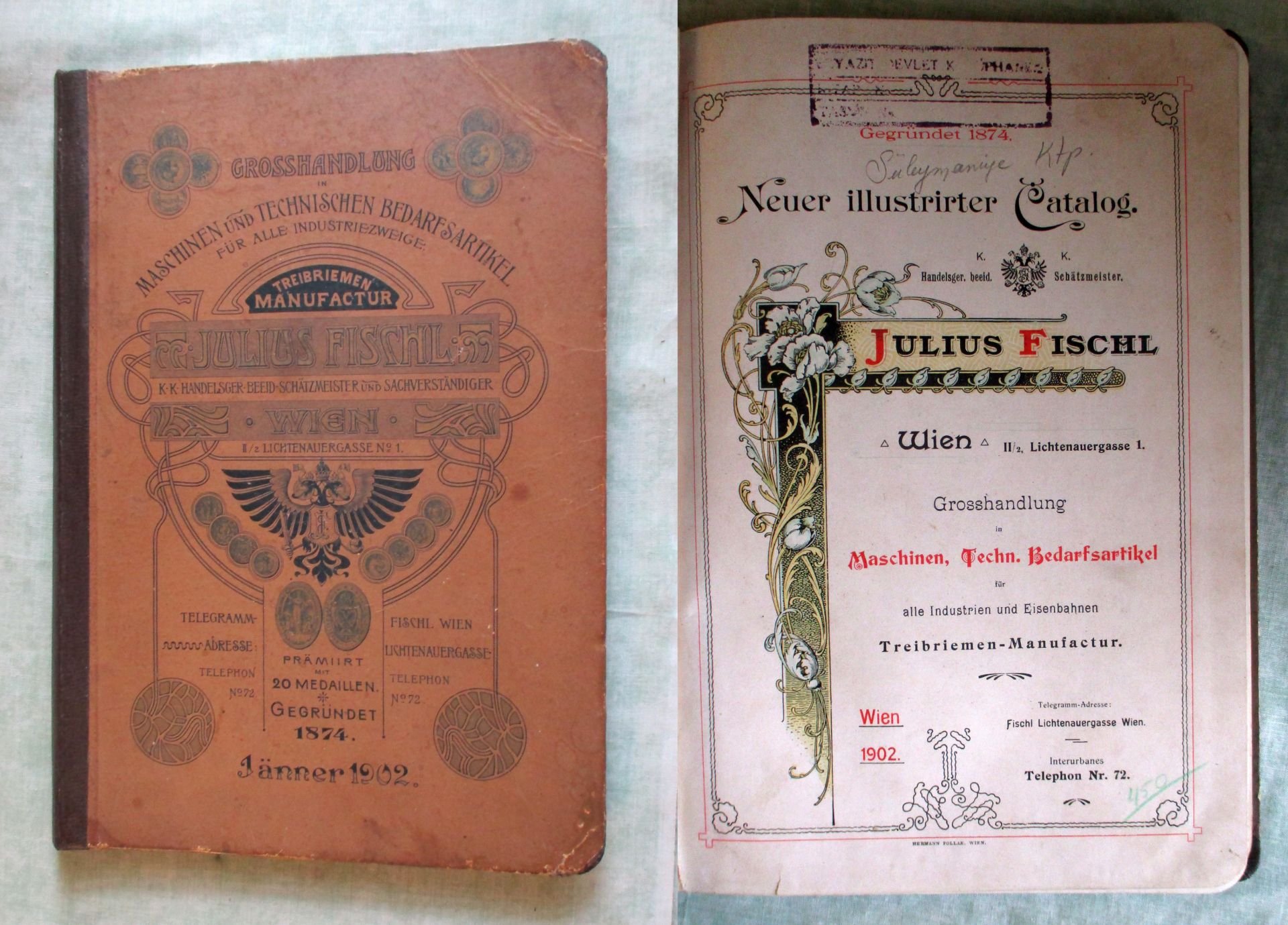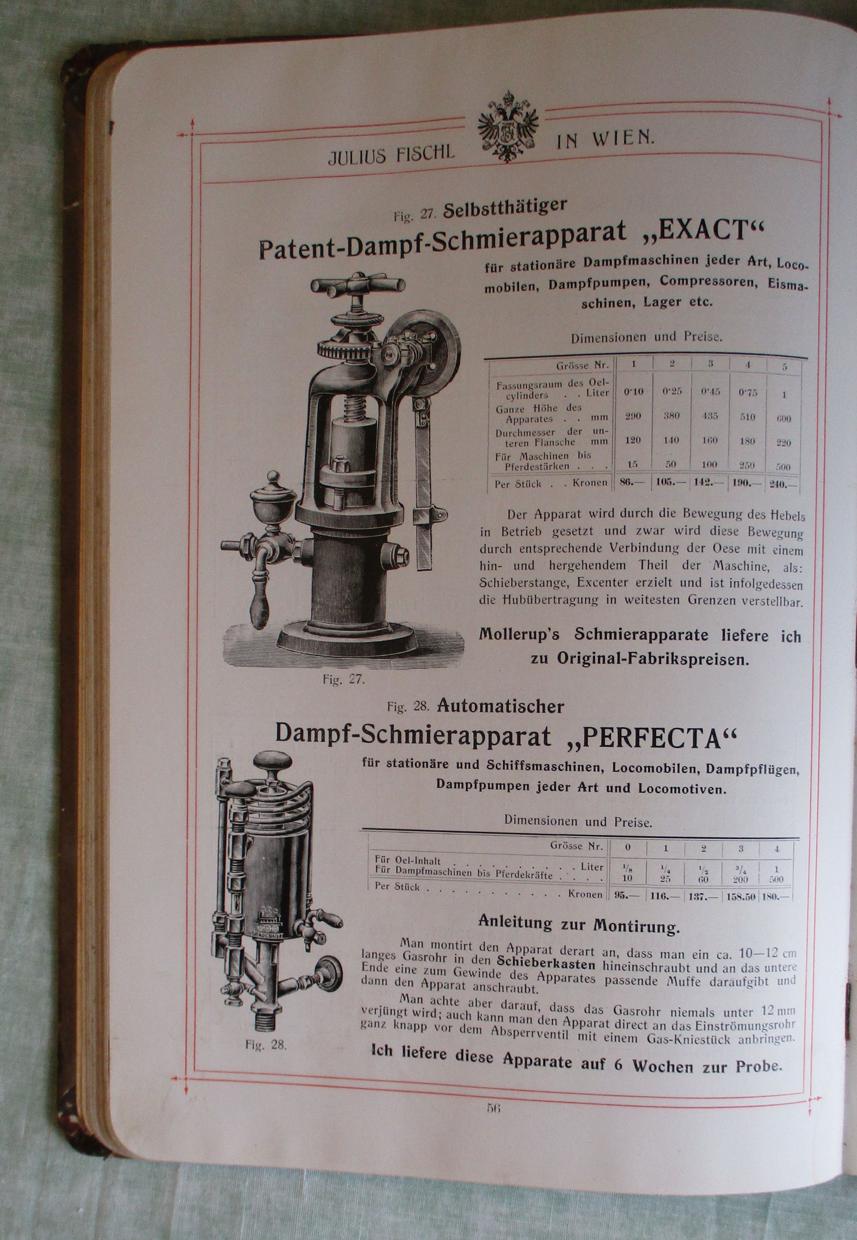 Firmengeschichte + Firmenkataloge Julius Fischl – Wien II/², Lichtenauergasse 1 – Grosshandlung in Maschinen, Techn. Bedarfsartikel für alle Industrien und Eisenbahnen. – Treibriemen-Manufactur. Neuer Illustrirter Catalog. Wien. 1902. 200 Seiten, durchgehend illustriert. Hardcover. Ecken bestossen und leicht staubfleckig. Innen einwandfrei. Maschinen, Ventile, Schmieraparate, Werkzeuge aller Art, Drehbänke, Waagen, Pumpen, Feuerspritzen, Bleche, Motore, Lampen usw.