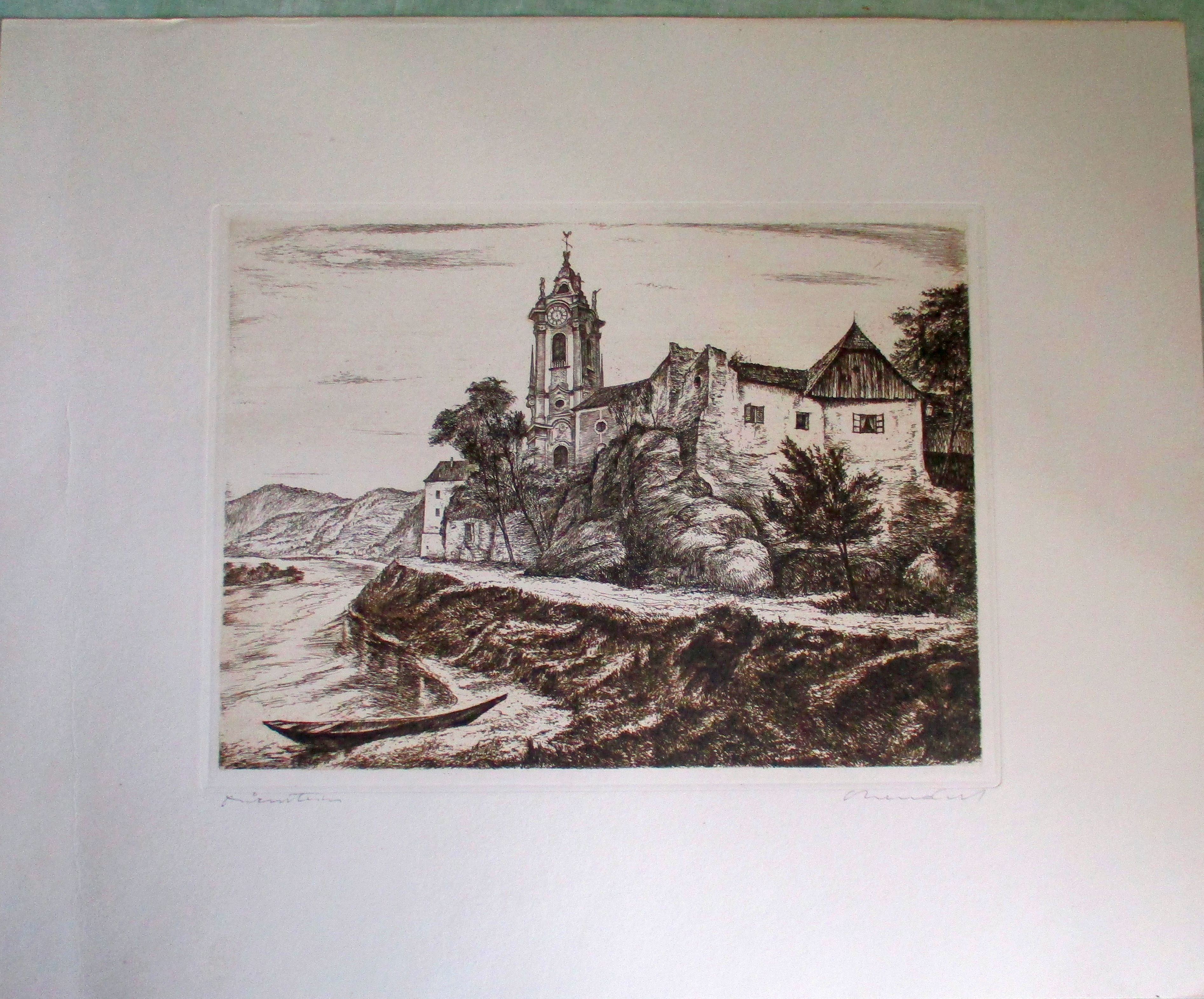 Niederösterreich – Orts- und Landeskunde Neudert, Otto. Burgen und Städte in Niederdonau. 12 Originalradierungen mit 4 Seiten einleitendem Text von Dr. Heinrich Neumayer. 1944. Quer-Folio (35 x 42 cm), Flügelmappe m. aufkaschiertem Deckelschild. Mappe staubfleckig, Ecken bestossen, Innenbezug des vorderen Mappendeckels fehllt. Radierungen tadellos. Radierungen zum Teil beschriftet und signiert. Original-Radierungen mit Ansichten von Dürnstein, Eggenburg, Gloggnitz, Klamm, Melk, Rosenburg, Stockzahn, Waidhofen, Forchtenstein, Brün, Iglau und Theben.